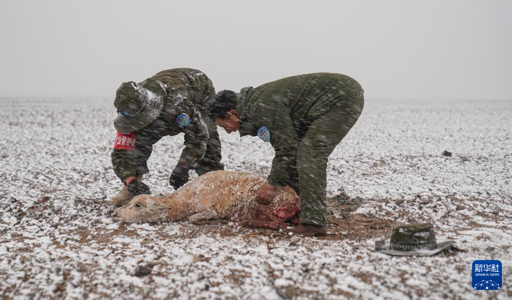 6月14日,西藏那曲市尼瑪縣境內的羌塘國家級自然保護區(qū)“無人區(qū)”深處,在野生動物專業(yè)管護隊臨時宿營地附近,一只在藏羚羊遷徙路上等候已久的野狼撲向遷徙的藏羚羊群中一只懷孕的母羊,咬向肚子和脖子。激烈掙扎的藏羚羊掙脫后,靠著最后的一點力氣跑向野保隊營地,野狼不敢靠近營地而不得不離去。野保隊員看到在風雪中掙扎的母羊,把它運回營地進行救助。但由于傷勢太重,肚皮被咬開且內臟嚴重受損,野保隊員只能將母羊的肚皮縫上之后,按照慣例將受傷的母羊抬放在羌塘大草原。