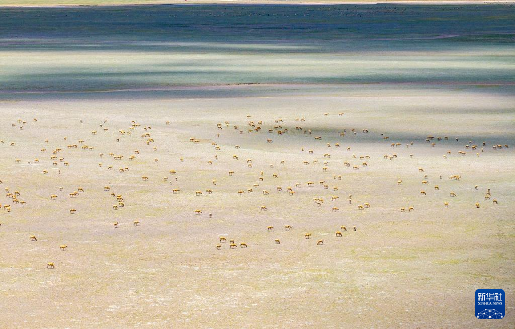 藏羚羊在魯確塘草原集結(jié)(無(wú)人機(jī)照片,6月8日攝)。新華社記者 姜帆 攝