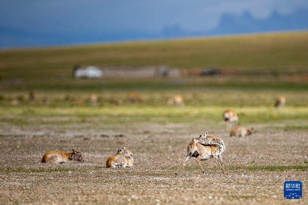魯確塘草原上,藏羚羊護(hù)著剛出生的孩子(6月17日攝)。新華社記者 晉美多吉 攝
