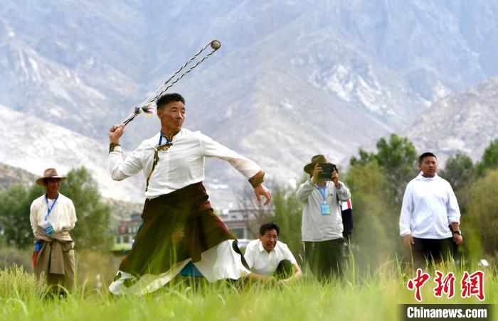 6月23日,西藏拉薩,參賽選手在拉薩首屆農(nóng)牧民運動會上進行“古朵”比賽。李林 攝