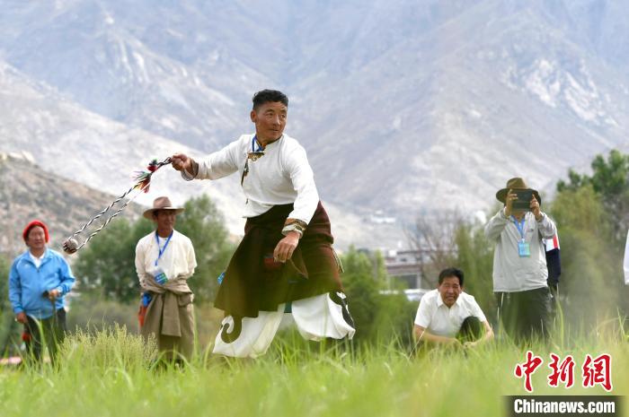 古朵指的是用牦牛毛或者山羊毛編織成的拋石繩,可以將石頭投擲到較遠(yuǎn)的地方,是牧民們用來(lái)放牧的工具。圖為6月23日拉薩首屆農(nóng)牧民運(yùn)動(dòng)會(huì)上,參賽選手正進(jìn)行古朵比賽。中新社記者 李林 攝