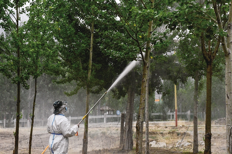 病因找到了,如何對(duì)癥下藥才是關(guān)鍵。防治隊(duì)將整片楊樹(shù)林分成三個(gè)區(qū)域,首先伐掉干死腐爛的樹(shù),其次對(duì)病害區(qū)域進(jìn)行殺菌消毒?!懊總€(gè)區(qū)域我們噴灑的藥劑也不同,主要是想對(duì)防治效果進(jìn)行實(shí)驗(yàn)。通過(guò)持續(xù)兩個(gè)月的觀察,發(fā)現(xiàn)第一組藥劑防治效果明顯,因此我們開(kāi)始在整片楊樹(shù)林推廣第一組藥劑?!秉S敏說(shuō)。