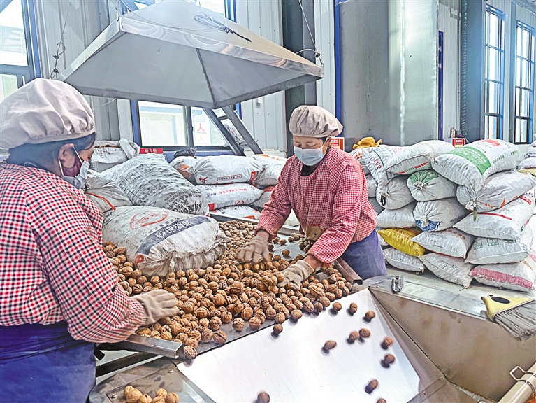 圖為工人們在挑選野生山核桃油的原料—核桃。