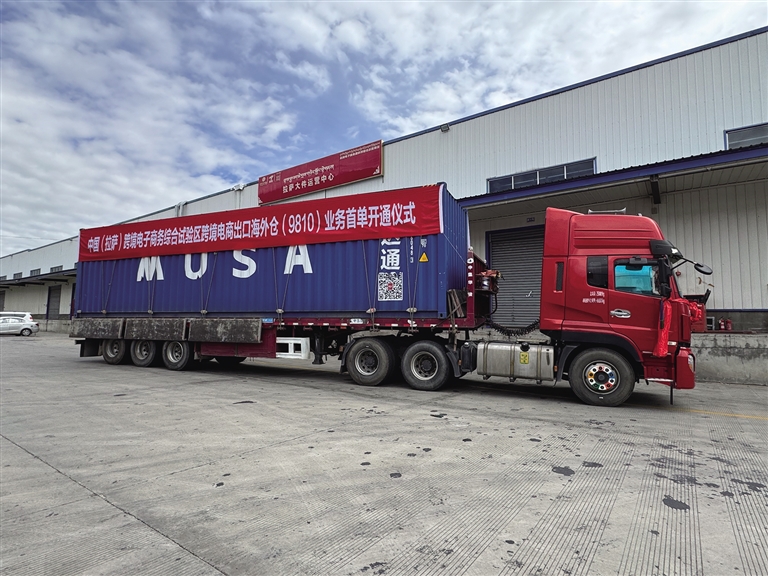陽光透過云層,灑在堆龍德慶區(qū)城投物流園區(qū)寬廣的場地上,兩輛載有藍色集裝箱的卡車停靠在物流倉前,十分引人注目。這是中國(拉薩)跨境電子商務綜合試驗區(qū)跨境電商出口海外倉“9810”業(yè)務首單,它們將跨越喜馬拉雅山,將滿載的服裝百貨、家用電器等商品送往尼泊爾加德滿都市的海外倉。