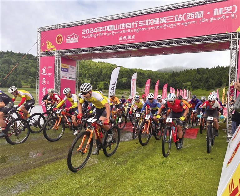 6月29日,2024年中國山地自行車聯(lián)賽第三站(西藏·林芝)在林芝市比日山國家森林公園天邊牧場(chǎng)開賽。來自全國各省、自治區(qū)、市的16支專業(yè)代表隊(duì),以及業(yè)余選手、自行車愛好者們一同角逐競(jìng)技。