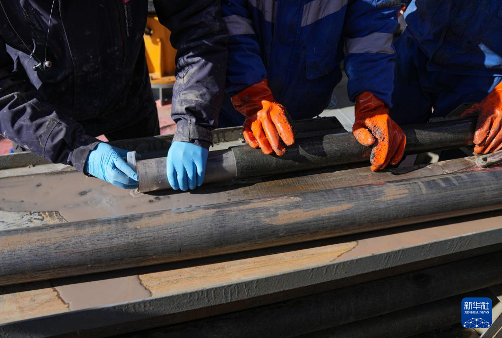 7月11日,鉆探人員提起內(nèi)管,準(zhǔn)備提取湖泊巖芯。新華社記者 晉美多吉 攝