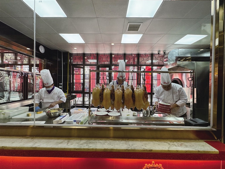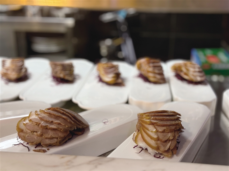 全聚德拉薩店選址于仙足島濱河路二期,店鋪設計匠心獨運,將古樸典雅的外部風貌與簡約優(yōu)雅的現(xiàn)代內(nèi)部裝飾巧妙融合。墻壁上隨處可見的掛畫在介紹著店鋪歷史的同時,更為空間增添了一抹藝術氣息。開業(yè)當天,隨著歡快的開場舞響起,慶典活動正式拉開帷幕?,F(xiàn)場,片鴨師傅們以精湛的技藝展示著全聚德的獨特魅力,一只只色澤誘人的烤鴨在他們的巧手下化身為薄如蟬翼的鴨肉片,搭配新鮮的蔥絲、黃瓜條及特制甜面醬卷入薄餅中,一口咬下,鮮美與香甜在口中瞬間綻放,令人回味無窮。
