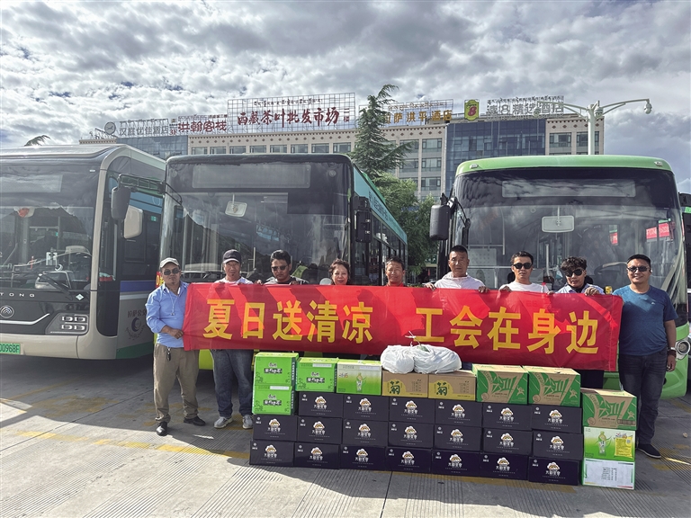 “快來(lái)吃點(diǎn)西瓜,喝點(diǎn)水休息一下吧。”7月17日,一陣溫馨的聲音傳入拉薩市公安局交警支隊(duì)城北大隊(duì)女子中隊(duì)及柳梧新區(qū)公交樞紐站堅(jiān)守在戶外崗位的勞動(dòng)者耳中。為了表達(dá)對(duì)一線民警和公交車司機(jī)的敬意和關(guān)懷,拉薩市總工會(huì)為交警和60名駕駛員送上飲料、水果等夏日解暑“利器”,送上關(guān)愛(ài)的同時(shí),對(duì)高溫下仍堅(jiān)守崗位、戰(zhàn)斗在執(zhí)勤執(zhí)法第一線的民輔警所做的貢獻(xiàn)表示誠(chéng)摯感謝;叮囑駕駛員要好好保重身體,注意勞逸結(jié)合,不要疲勞上崗,在做好工作的同時(shí),做好自身防暑降溫工作,安全度夏、清涼度夏。