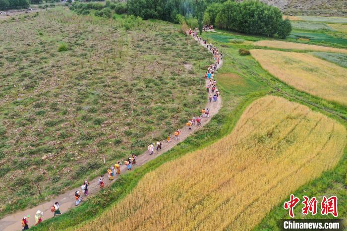 7月24日,西藏拉薩市曲水縣南木村迎來了一年一度的“望果節(jié)”。當(dāng)日,村民們盛裝打扮背上經(jīng)文,圍繞全村田園轉(zhuǎn)上一圈,轉(zhuǎn)到每一塊農(nóng)田前都要煨桑祈求風(fēng)調(diào)雨順、五谷豐登?!巴?jié)”民俗已有1500多年的歷史,是國家級非物質(zhì)文化遺產(chǎn)。圖為曲水縣南木村村民身著盛裝背上經(jīng)文繞田。中新社記者 貢嘎來松 攝