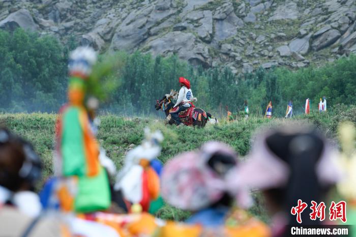 7月24日,西藏拉薩市曲水縣南木村迎來了一年一度的“望果節(jié)”。當(dāng)日,村民們盛裝打扮背上經(jīng)文,圍繞全村田園轉(zhuǎn)上一圈,轉(zhuǎn)到每一塊農(nóng)田前都要煨桑祈求風(fēng)調(diào)雨順、五谷豐登?!巴?jié)”民俗已有1500多年的歷史,是國家級非物質(zhì)文化遺產(chǎn)。圖為曲水縣南木村村民身著盛裝騎馬繞田。中新社記者 貢嘎來松 攝
