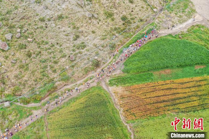7月24日,西藏拉薩市曲水縣南木村迎來了一年一度的“望果節(jié)”。當(dāng)日,村民們盛裝打扮背上經(jīng)文,圍繞全村田園轉(zhuǎn)上一圈,轉(zhuǎn)到每一塊農(nóng)田前都要煨桑祈求風(fēng)調(diào)雨順、五谷豐登?!巴?jié)”民俗已有1500多年的歷史,是國家級非物質(zhì)文化遺產(chǎn)。圖為曲水縣南木村村民身著盛裝背上經(jīng)文繞田。(無人機(jī)照片)中新社記者 貢嘎來松 攝