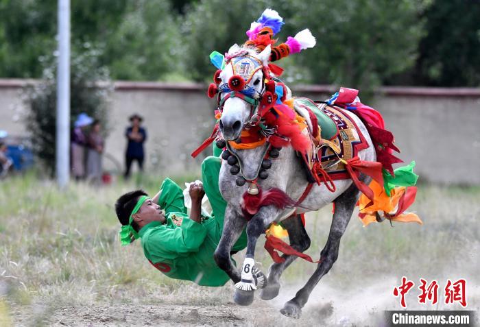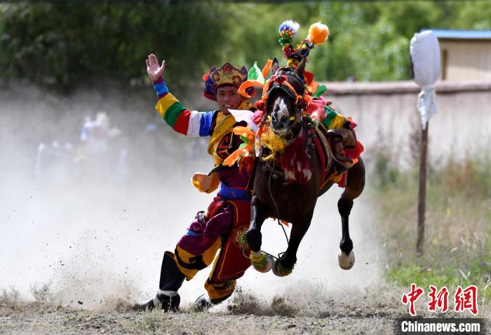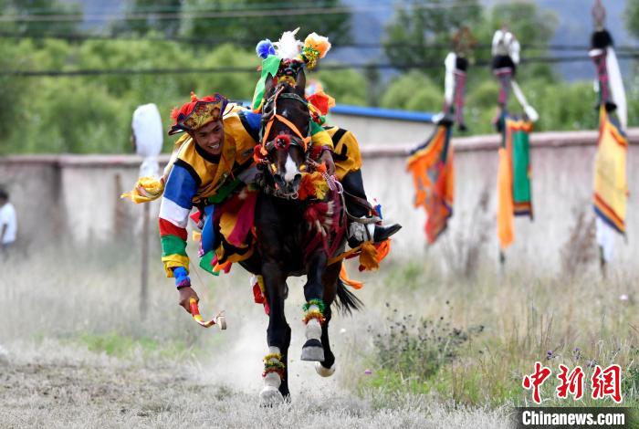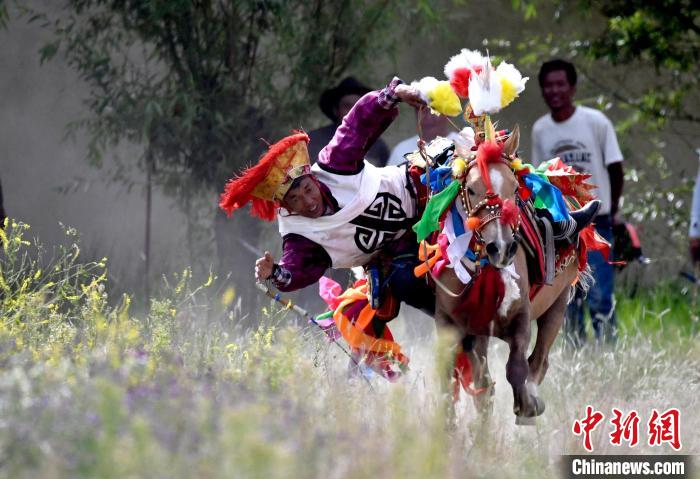 7月27日,西藏拉薩市桑達村迎來“望果節(jié)”,村民們舉行賽馬活動慶祝?!巴?jié)”是西藏傳統(tǒng)的豐收節(jié),具體日期隨各地莊稼成熟的時間而變化?!巴?jié)”期間,按照習俗,各地都會舉辦賽馬比賽。圖為騎手進行馬術表演。中新社記者 李林 攝