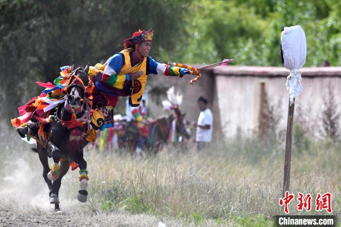 7月27日,西藏拉薩市桑達村迎來“望果節(jié)”,村民們舉行賽馬活動慶祝。“望果節(jié)”是西藏傳統(tǒng)的豐收節(jié),具體日期隨各地莊稼成熟的時間而變化?!巴?jié)”期間,按照習俗,各地都會舉辦賽馬比賽。圖為騎手進行馬上射箭表演。中新社記者 李林 攝