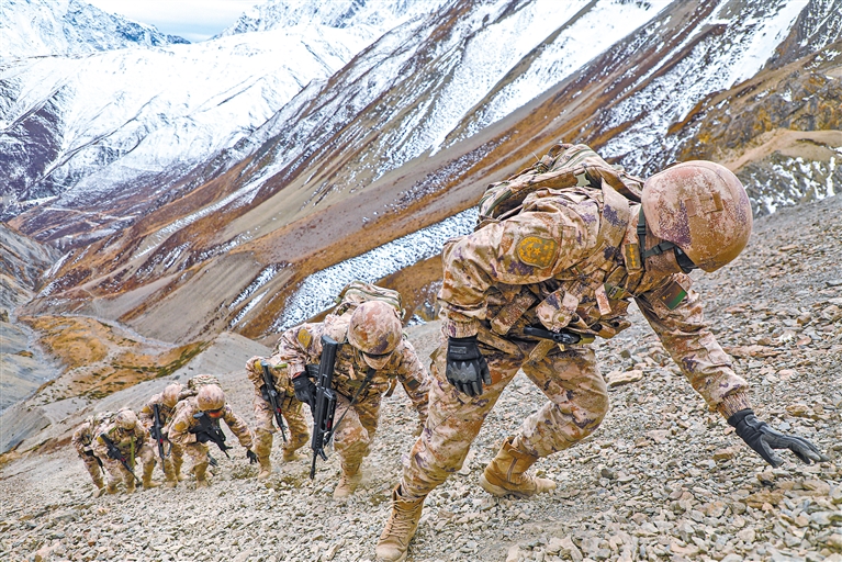圖為駐藏某部官兵巡邏途中攀爬碎石坡。崔運紅 攝