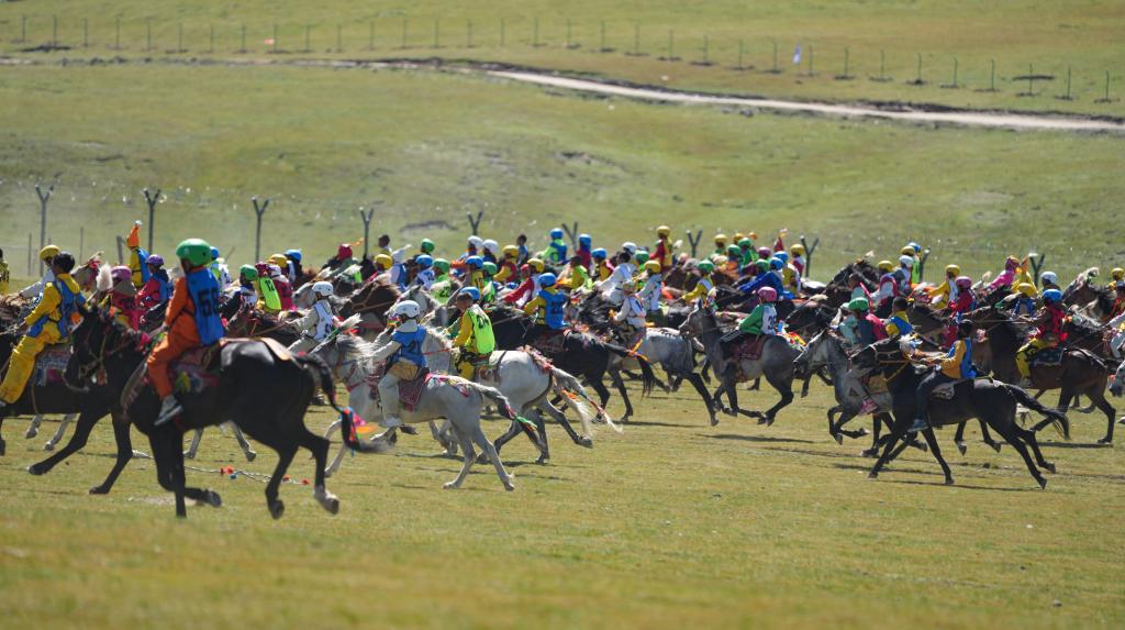 12日,10公里傳統(tǒng)大跑項(xiàng)目開(kāi)賽,上百匹駿馬在草原上揚(yáng)蹄疾奔,騎手多是十來(lái)歲的少年。15歲的普扎巴從6歲開(kāi)始做騎手,曾騎著當(dāng)?shù)卦S多名馬到各地參加比賽,拿過(guò)多次冠軍。“我相信這次也能拿第一名。”10日,他在馬背上對(duì)記者說(shuō)。