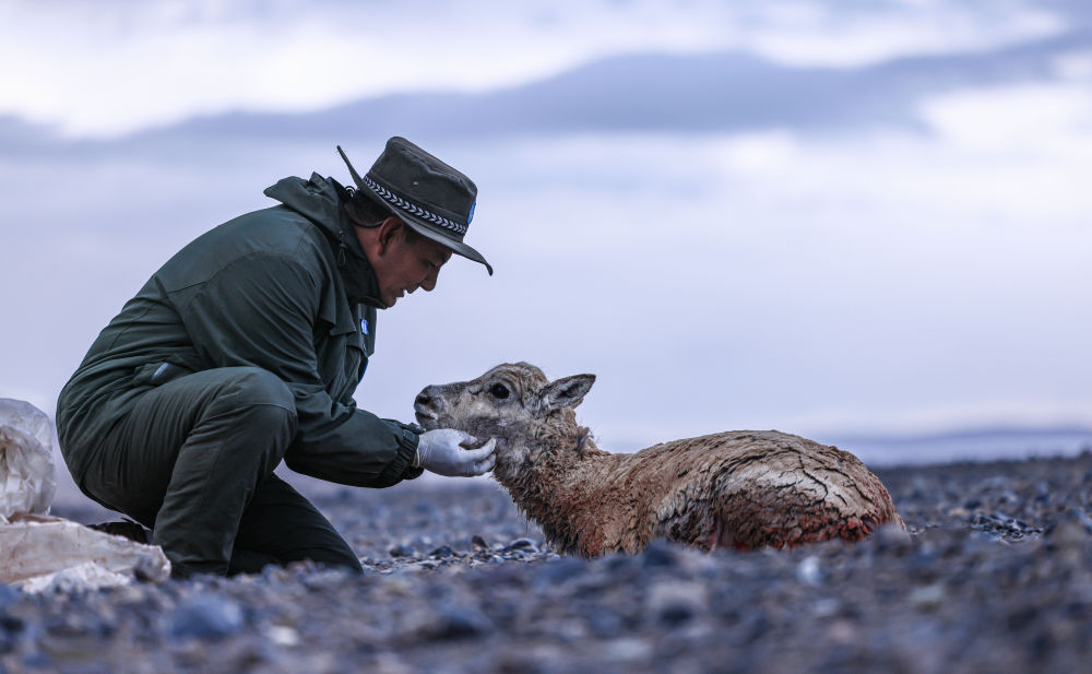 2024年6月14日,野生動物專業(yè)管護隊員在西藏羌塘國家級自然保護區(qū)核心區(qū)安撫受傷的母藏羚羊。