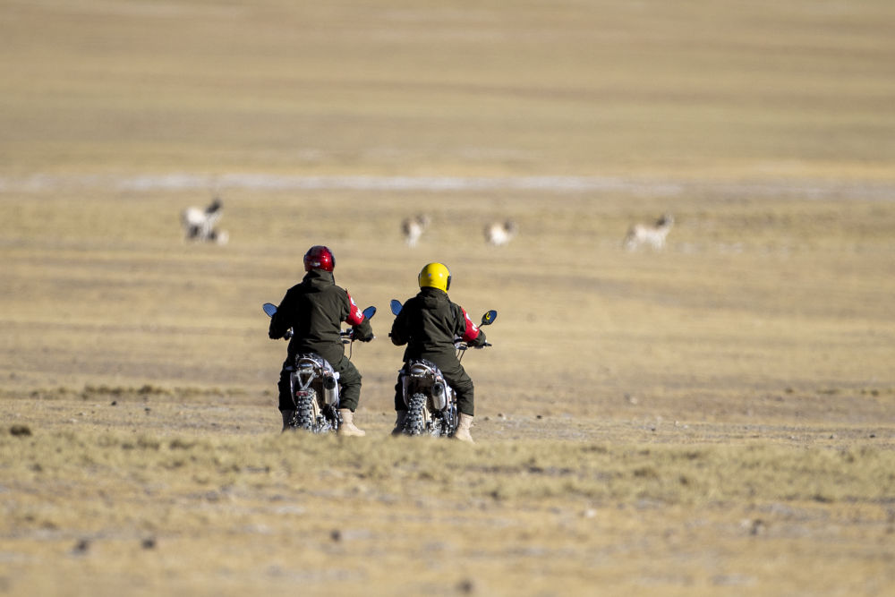 2023年12月17日,在西藏羌塘國家級自然保護區(qū),野生動物管護隊員騎著摩托車觀察藏羚羊。