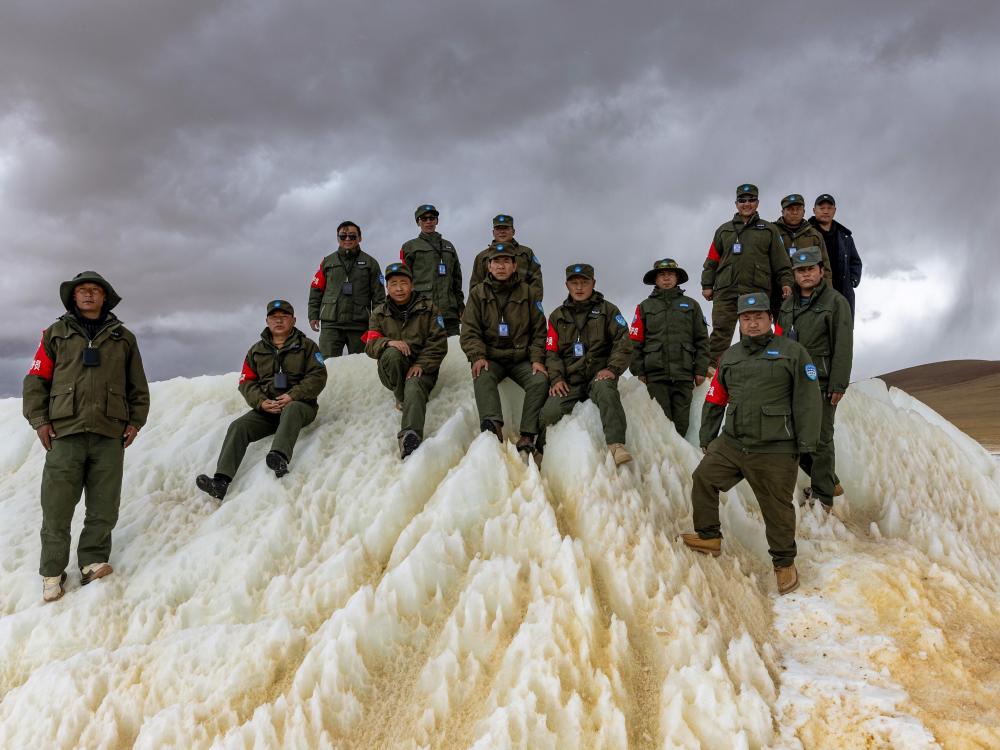 2024年5月7日,在西藏羌塘國家級自然保護區(qū),野生動物專業(yè)管護隊員在巡護路上一處埡口的冰雪堆上合影。