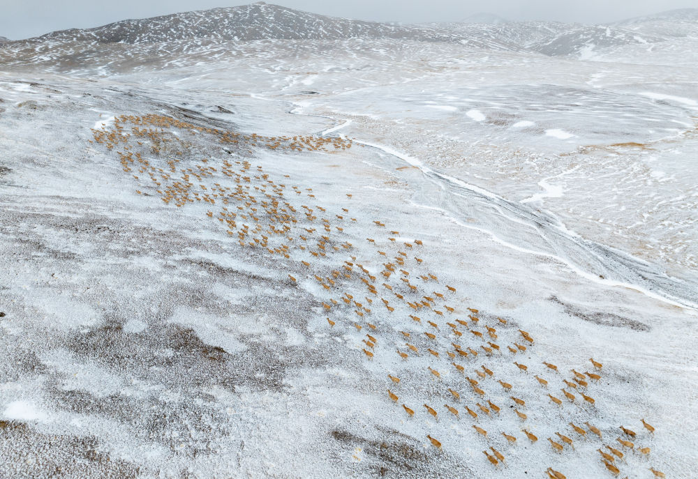 2024年6月15日清晨雪后,在西藏羌塘國家級自然保護區(qū),一群藏羚羊迎著朝霞前行在遷徙路上。