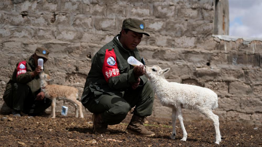 2024年7月13日,西藏那曲市尼瑪縣措羅木管護站野保員在給白色藏羚羊幼崽喂奶。