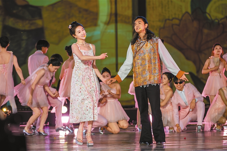 湖南民謠樂隊與山南搖滾樂隊帶來全新創(chuàng)作歌曲《雅礱歡歌》。這首歌以湖南童謠《月亮粑粑》和山南童謠為創(chuàng)作基底,兩支青春樂隊與山南職高的15名吉他手共同奏響青春樂章,“融”出別樣精彩。開幕式晚會將《次仁拉索》和《今天你要嫁給我》進(jìn)行了巧妙的“嫁接”,講述了各民族在交往交流交融中涌現(xiàn)出的愛情故事。