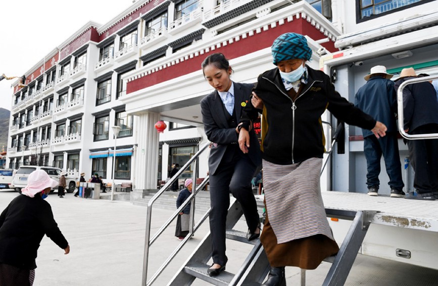 圖為農(nóng)行山南乃東支行客戶經(jīng)理娜姆措(左一)攙扶老人走下流動金融服務(wù)車。旦增蘭澤攝