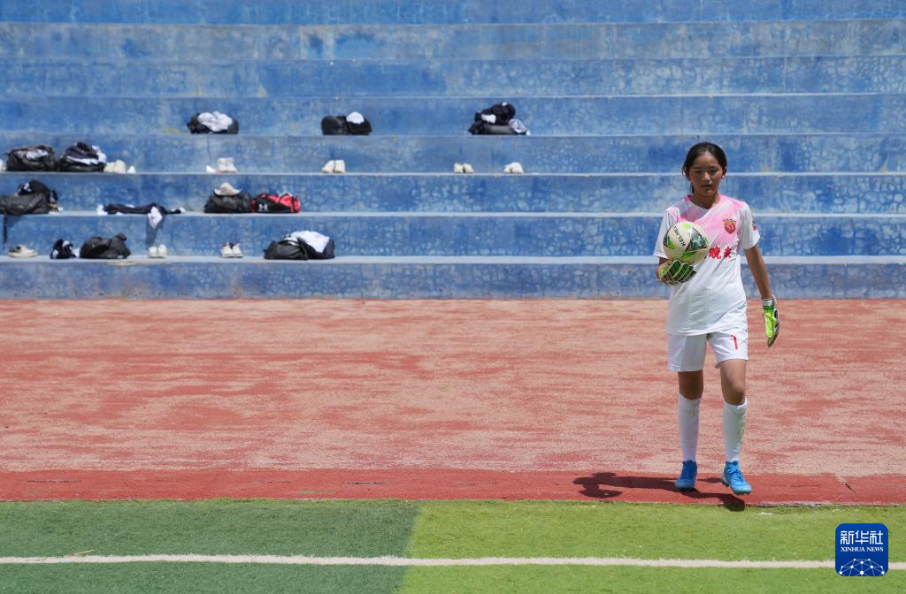 在西藏日喀則市上海實(shí)驗(yàn)學(xué)校,“珠峰雪鷹”女子足球隊(duì)守門員邊普在操場(chǎng)上訓(xùn)練(9月3日攝)。|新華社記者 丁汀 攝