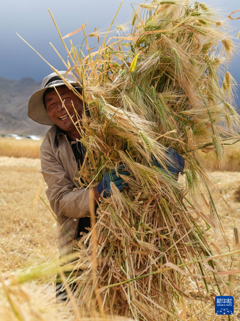 9月10日,西藏日喀則市白朗縣巴扎鄉(xiāng)農民在收獲青稞。新華社記者 晉美多吉 攝
