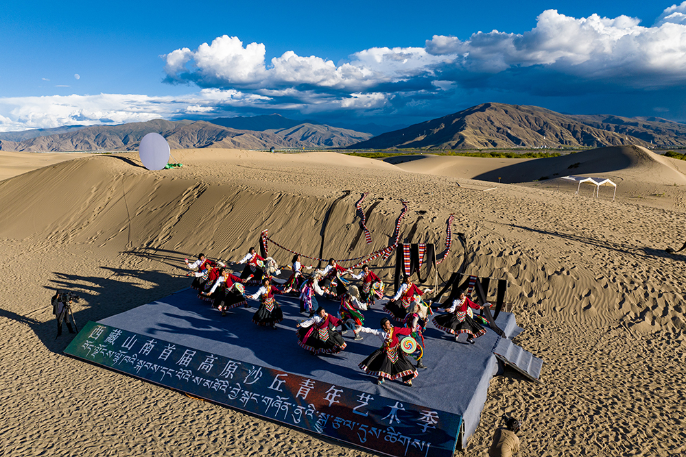 西藏山南首屆“高原沙丘青年藝術(shù)季”非遺歌舞展演現(xiàn)場(無人機照片,9月15日攝)。新華網(wǎng) 旦增努布 攝