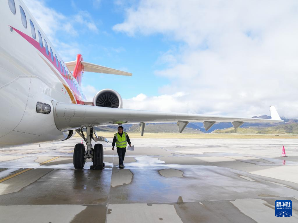 9月21日,在青海果洛瑪沁機(jī)場(chǎng),機(jī)務(wù)人員在對(duì)國(guó)產(chǎn)商用飛機(jī)ARJ21進(jìn)行短停檢查。新華社記者 丁汀 攝