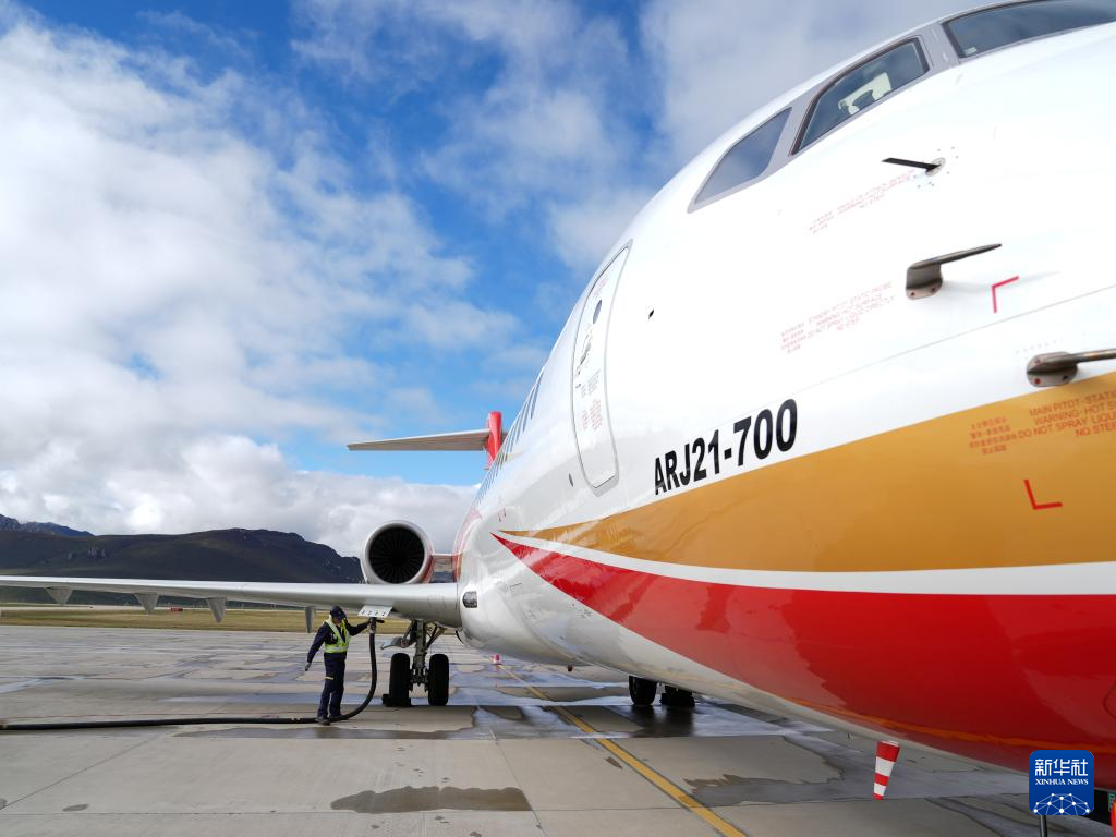 9月21日,在青海果洛瑪沁機(jī)場(chǎng),工作人員在為國(guó)產(chǎn)商用飛機(jī)ARJ21加油。新華社記者 丁汀 攝