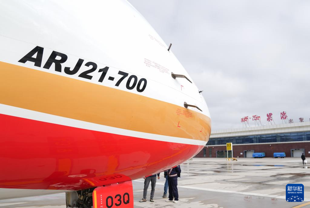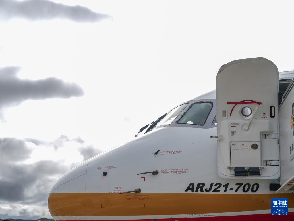9月21日,國(guó)產(chǎn)商用飛機(jī)ARJ21飛抵青海果洛瑪沁機(jī)場(chǎng)。新華社記者 丁汀 攝