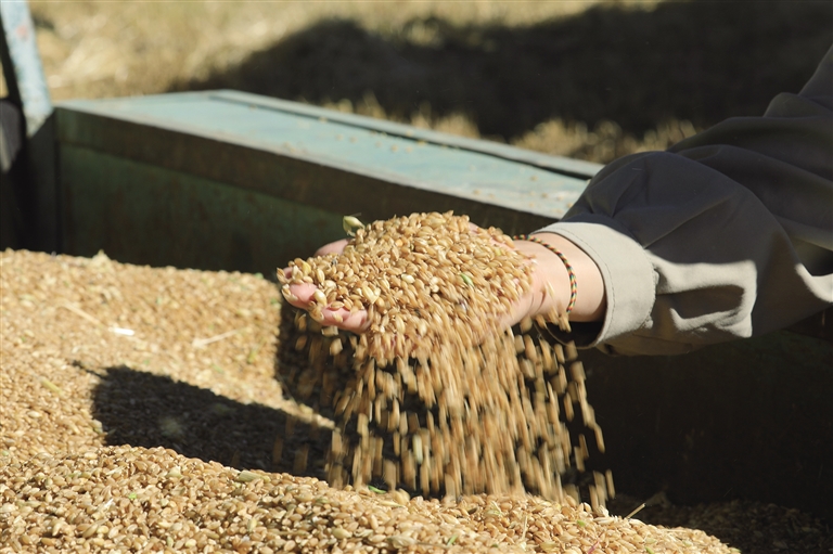 “我家共有92畝多的農(nóng)田,家里有三個勞力,我負責秋收,其余兩個外出務(wù)工,以前我們家秋收工作需要一個月多的時間,現(xiàn)在農(nóng)業(yè)機械化了,再也不用擔心秋收工作,聽說今年賣良種每斤有0.3元的補貼,準備把自家10000斤良種賣掉,預計今年有56000多元的收入?!闭诎徇\青稞粒的村民普瓊高興地說道。