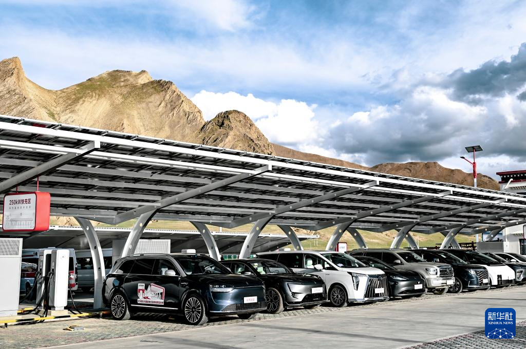 9月2日拍攝的日喀則市珠穆朗瑪國(guó)家公園北大門(mén)停車場(chǎng)內(nèi)的珠峰光儲(chǔ)液冷超充站。新華社發(fā)