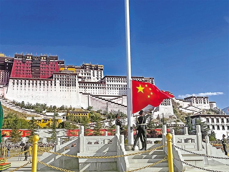 滿心中國紅、拳拳愛國情。10月1日上午,西藏舉行莊嚴(yán)的“升國旗、唱國歌”儀式,熱烈慶祝中華人民共和國成立75周年。自治區(qū)黨政軍領(lǐng)導(dǎo)與各族各界干部群眾代表,共同唱響禮贊新中國、奮進(jìn)新時代的主旋律,共同祝福偉大祖國繁榮昌盛,祝福西藏的明天更加美好。