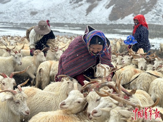 9月13日,西藏阿里地區(qū)日土縣熱幫鄉(xiāng)龍門卡村迎來了一場(chǎng)雪。在海拔近4800米的龍門卡村夏季牧場(chǎng),牧民們把待擠奶的白絨山羊依次用繩子拴起來。中青報(bào)·中青網(wǎng)記者 石佳/攝