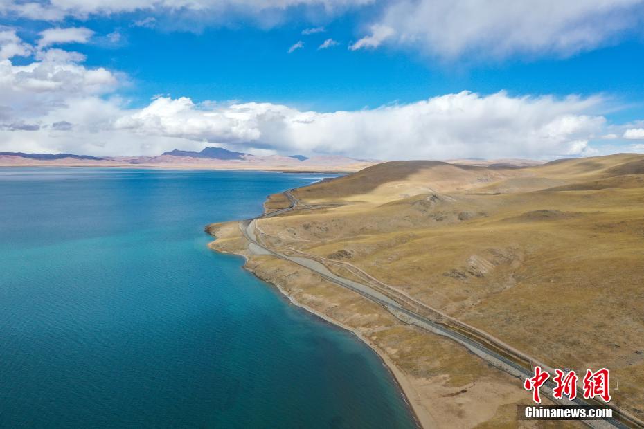 10月24日,鳥(niǎo)瞰深秋時(shí)節(jié)的錯(cuò)那湖,美景如畫(huà)。錯(cuò)那湖位于西藏自治區(qū)那曲市安多縣境內(nèi),是怒江的源頭湖。湖水在陽(yáng)光的照耀下,波光粼粼,湖岸線(xiàn)蜿蜒曲折,與周?chē)纳矫}、鐵路、草原共同描繪出一幅美麗的畫(huà)卷。中新社記者 貢嘎來(lái)松 攝