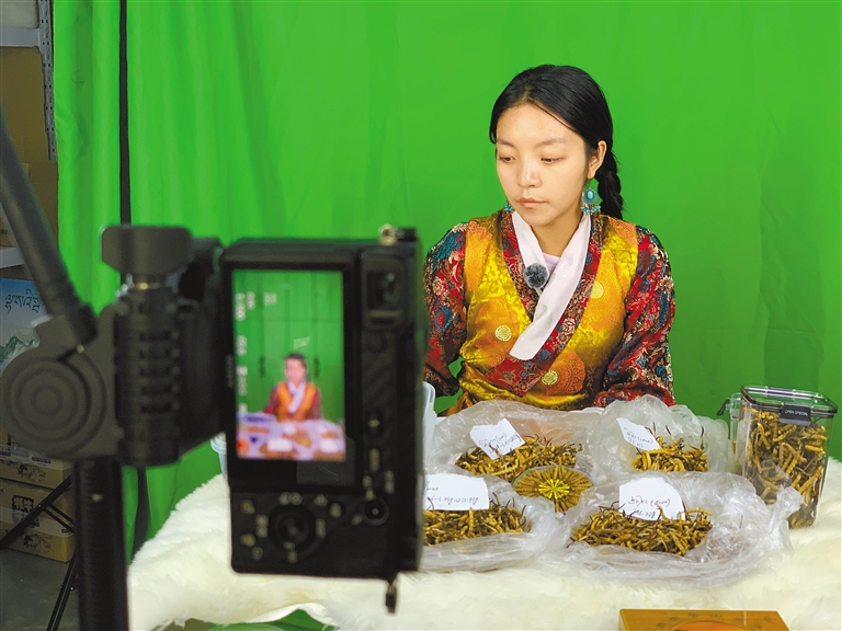 網(wǎng)紅“那曲拉姆”的原型系那曲市巴青縣瑪如鄉(xiāng)姑娘索朗巴央,在全網(wǎng)有400多萬粉絲。索朗巴央自2023年5月5日直播銷售牛肉干、藏紅花等,促進(jìn)本地特產(chǎn)銷售,增加農(nóng)牧民收入。 圖為“那曲拉姆”在直播間介紹西藏特產(chǎn)。受訪者提供