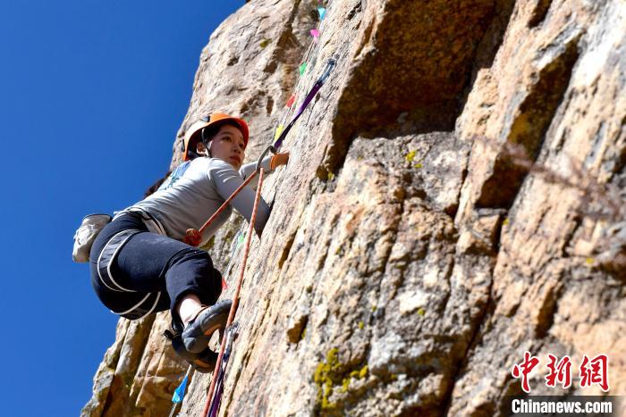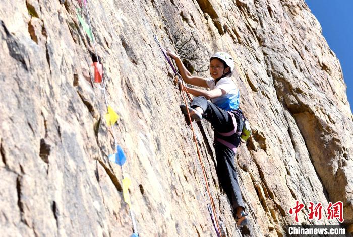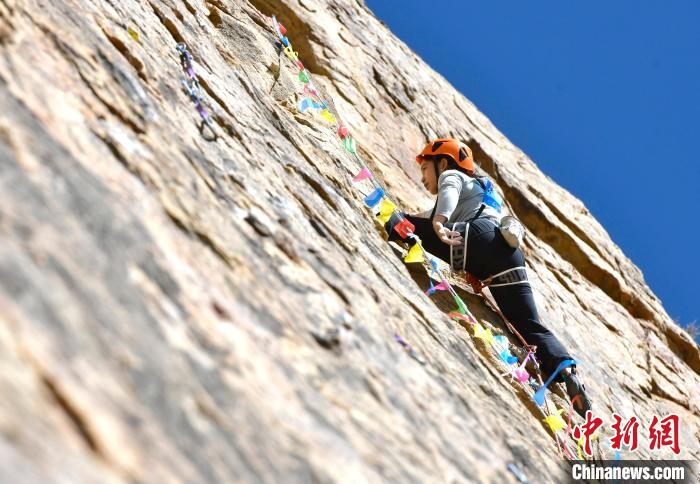11月17日,2024年西藏自治區(qū)攀巖自然巖壁公開賽決賽在拉薩市城關(guān)區(qū)奪底街道吉倉(cāng)自然巖壁場(chǎng)地舉行。本次賽事共有來自全國(guó)的55名選手參賽,分預(yù)賽和決賽兩輪。圖為參賽選手劉亞豪決賽中。中新社記者 李林 攝
