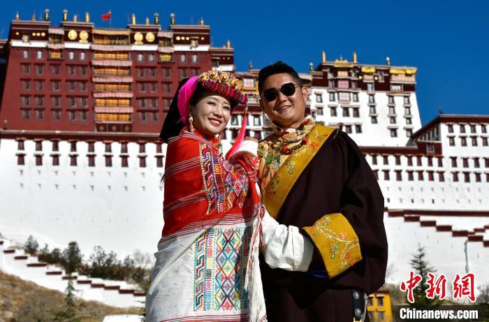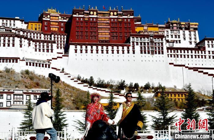 圖為12月3日,來自四川的勇忠阿旦(右一)和澤仁夏姆在布達(dá)拉宮廣場(chǎng)拍照留念。中新社記者 李林 攝