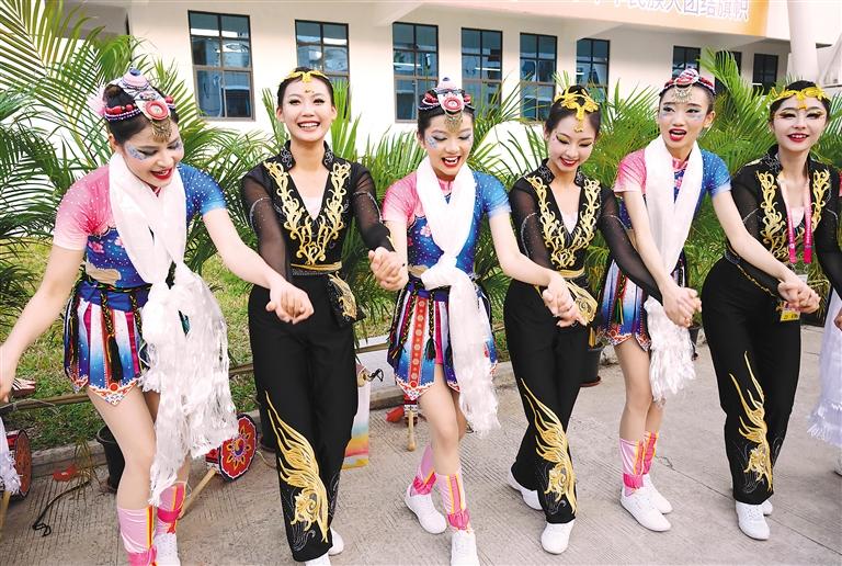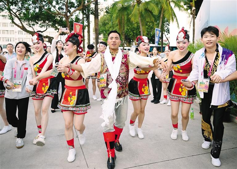 11月26日,運動會特別安排了“民族大聯(lián)歡”活動。獨具海南特色的牛角號與蛙鑼齊齊奏響,喜迎八方賓客,表演者、運動員、教練員一起手拉手載歌載舞。西藏運動員身著盛裝,和來自北京西藏中學的運動員一起唱藏歌、跳鍋莊、送禮物,和香港特別行政區(qū)運動員互送吉祥物、紀念品,相互交流、拍照留念。