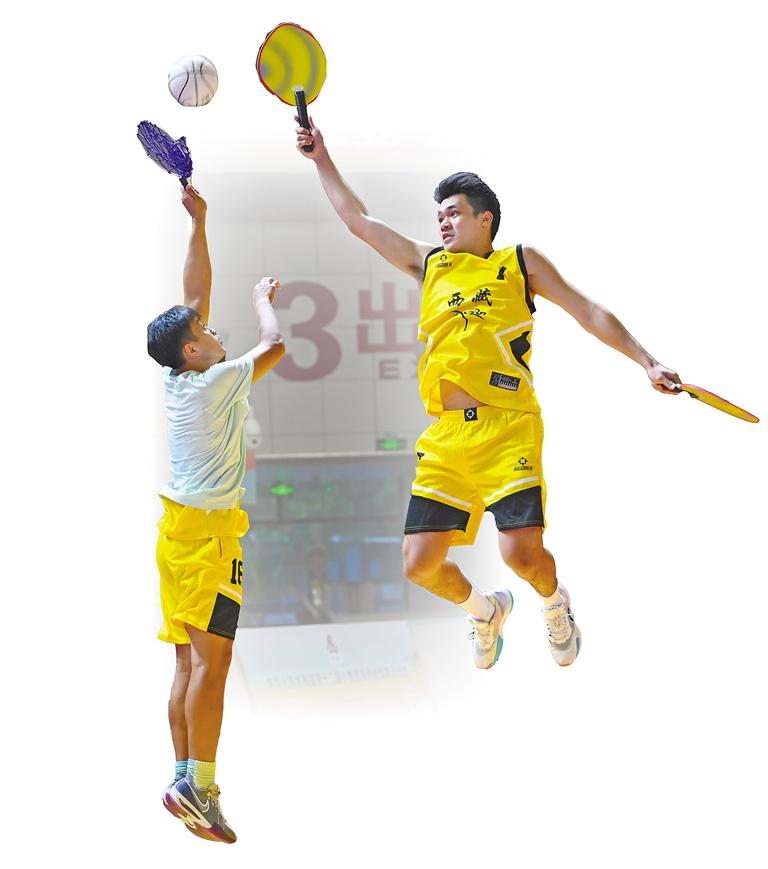 第十二屆全國少數(shù)民族傳統(tǒng)體育運動會西藏代表團運動員在進行珍珠球比賽賽前熱身。