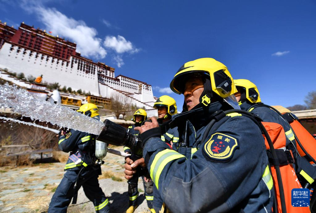 布宮消防救援大隊(duì)隊(duì)員在進(jìn)行消防演練(2018年4月2日攝)。新華社記者 晉美多吉 攝