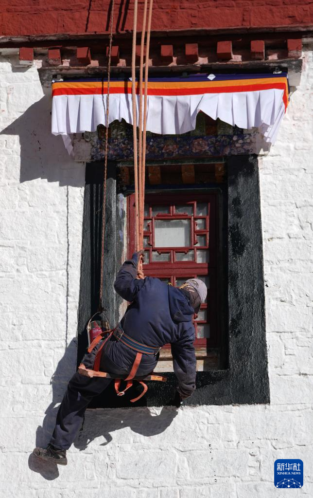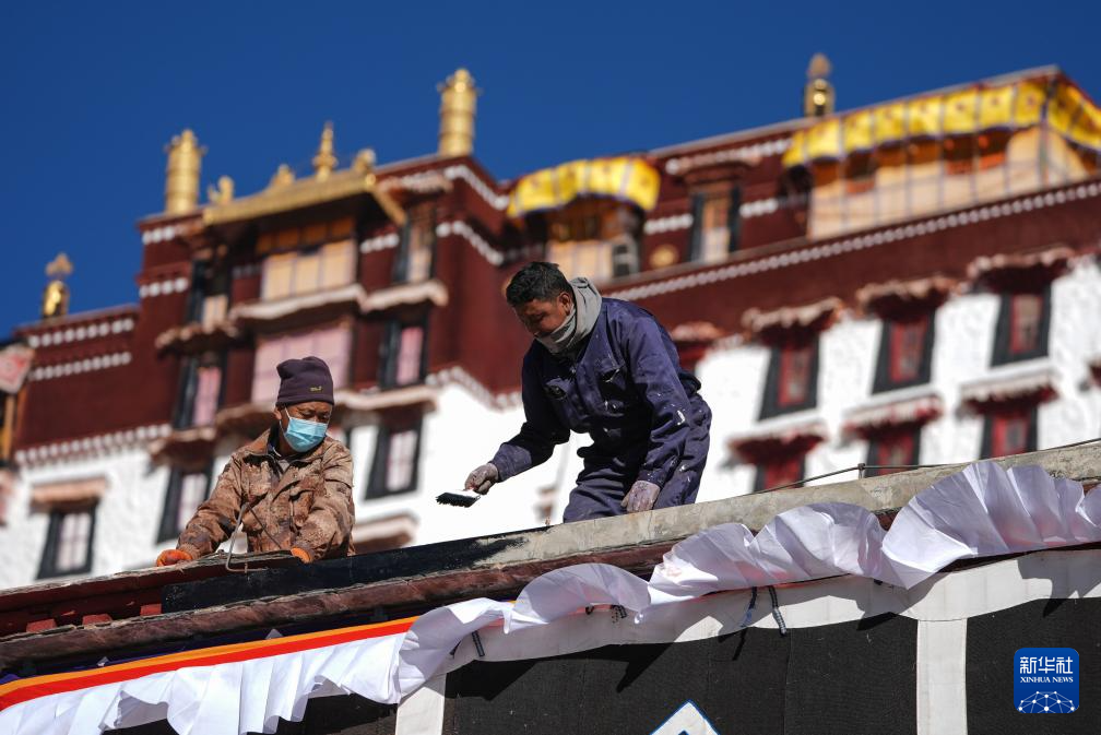 布達(dá)拉宮管理處維修科工作人員在粉刷墻體(12月4日攝)。新華社記者 晉美多吉 攝