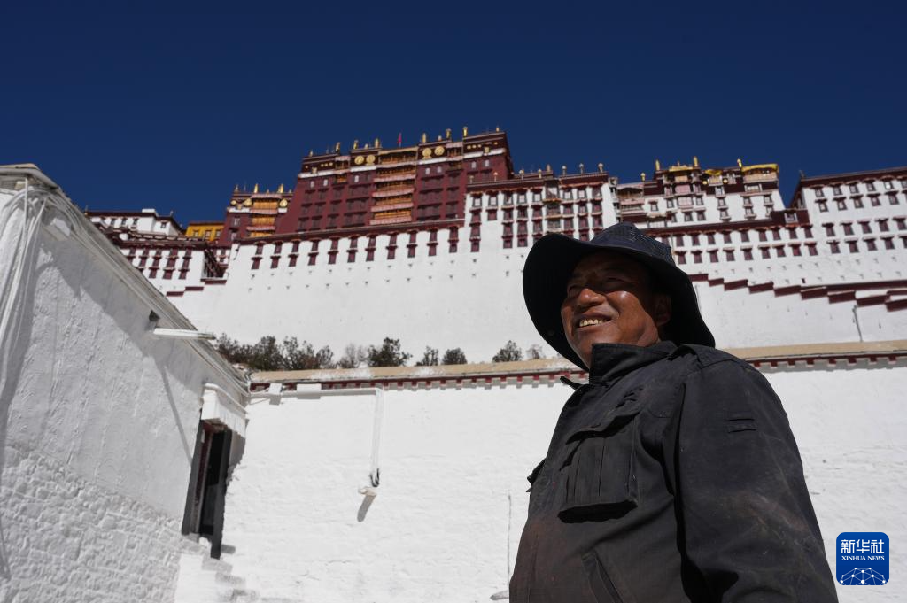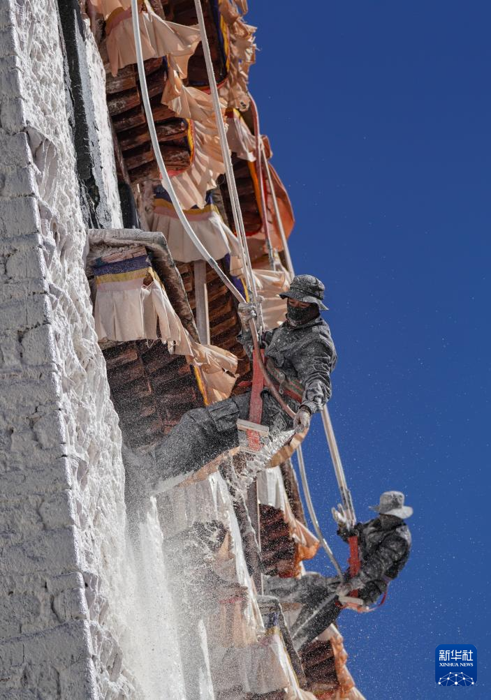 布達(dá)拉宮管理處維修科工作人員在噴灑涂料(10月30日攝)。新華社記者 晉美多吉 攝