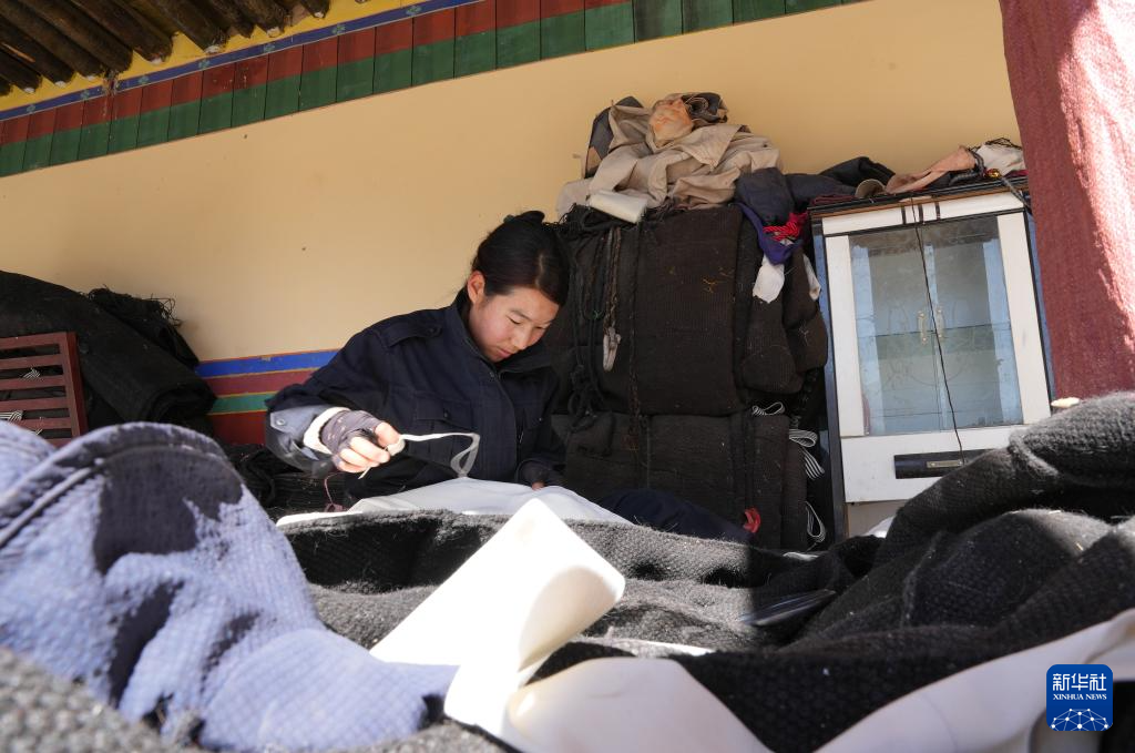 布達(dá)拉宮管理處維修科工作人員仁青在縫制門簾(12月4日攝)。新華社記者 晉美多吉 攝