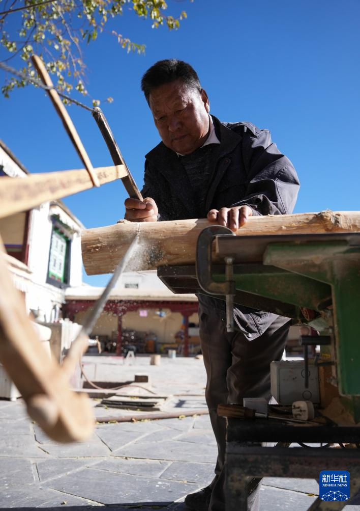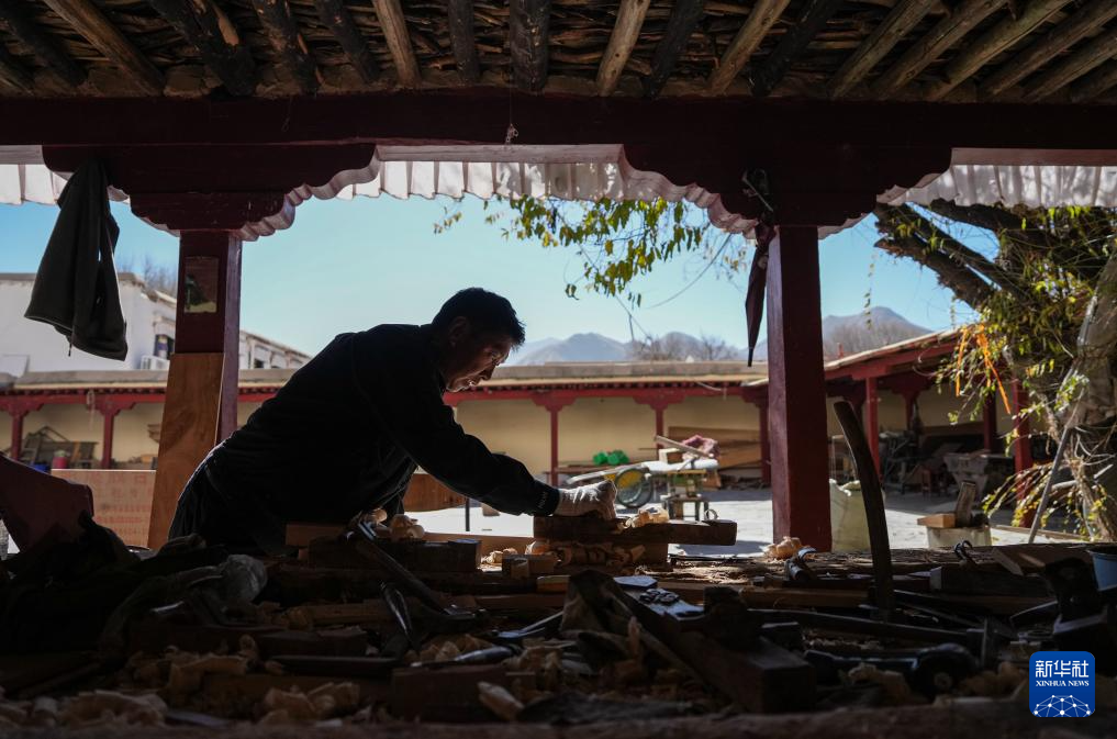 布達(dá)拉宮管理處維修科工作人員普瓊在制作修繕?biāo)璧哪緲?gòu)件(12月4日攝)。新華社記者 晉美多吉 攝
