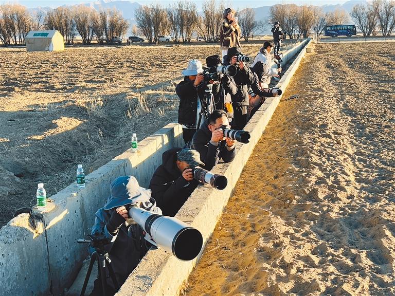 攝影愛(ài)好者在拍攝黑頸鶴。