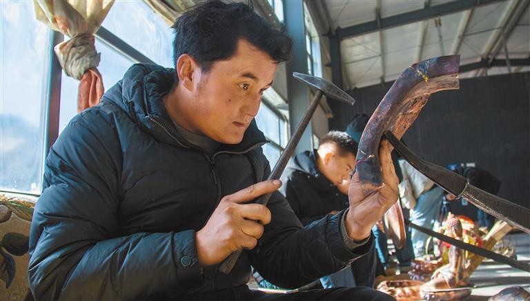 在國(guó)家級(jí)非遺孜東銅器作坊,工作人員正在制作銅器。