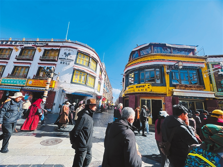 無論春夏秋冬,八廓街始終熱鬧非凡。每年春、夏、秋三季,國內(nèi)外游客紛至沓來;冬季,許多來自邊遠農(nóng)牧區(qū)的群眾會前來游玩、購買年貨。尤其是2024年“冬游西藏”活動的開啟,更是讓八廓街的人氣爆棚。走進八廓街,周邊的藏式特色建筑、琳瑯滿目的民俗風情商品、絡(luò)繹不絕的游客,共同構(gòu)成了一幅獨特而又和諧的畫面。這里商業(yè)與人文并存、傳統(tǒng)與現(xiàn)代交織,游客們既能感受到文化底蘊,又能享受到現(xiàn)代商業(yè)的便利和多元。